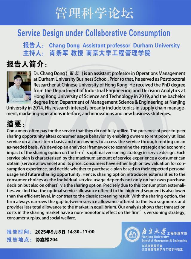 管理科学论坛:Service Design under Collaborative Consumption