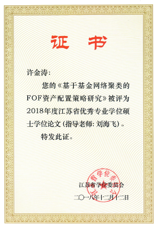据江苏省学位委员会、江苏省教育厅公布的“2018年江苏省优秀博士硕士学位论文”评选结果,公司14级硕士生许金涛同学的毕业论文《基于基金网络聚类的FOF资产配置策略研究》被评为2018年度江苏省优秀专业学位硕士学位论文。