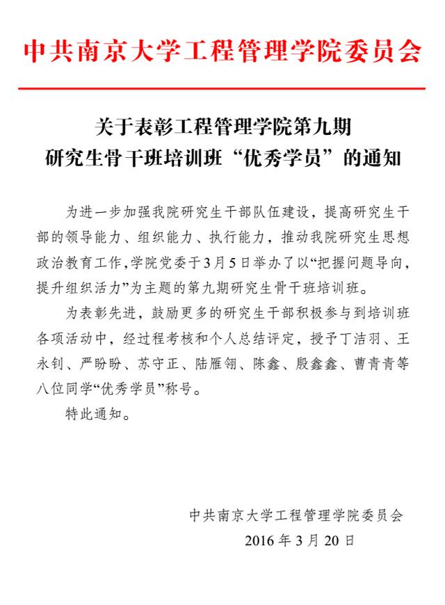 关于表彰第九期研究生骨干班培训班“优秀学员”的通知