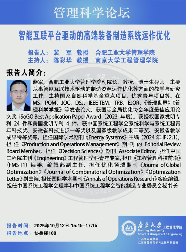 管理科学论坛:智能互联平台驱动的高端装备制造系统运作优化