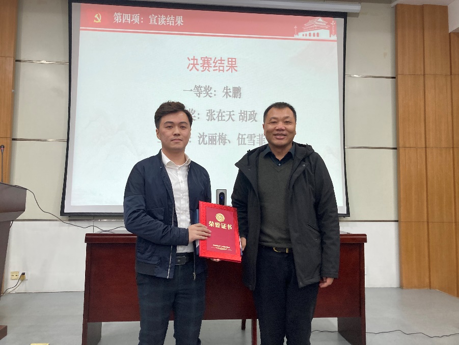 最终,经过现场评审,本次微党课大赛决赛评出一等奖1名:朱鹏《留学热与归国潮——青年留学归国历史回顾》;二等奖1名:张在天、胡政《新时代青年心系国家致力伟大复兴》;三等奖2名:沈丽梅《弘扬优良传统 担当强国使命》、伍雪菲《不忘初心 薪火相传》。工程管理公司党委书记陈志云依次为获奖选手颁奖并合影留念。