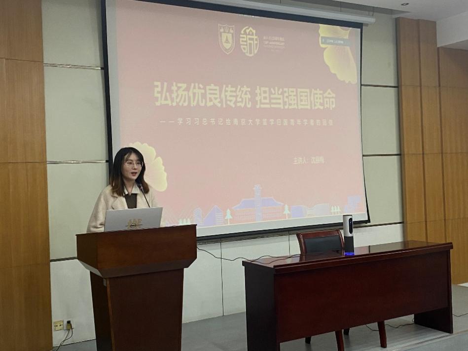 博士生党支部的伍雪菲同志展示了微党课《不忘初心 薪火相传》。从“留学报国,薪火相传”和“不忘初心,牢记使命”两个篇章展开,声情并茂地讲述了当代青年应如何心系国家事、肩扛国家责。她认为,南大学子应不忘初心,牢记使命,要始终保持积极向上的精神状态,把志气、骨气、底气作为我们新时代青年的底色。朱张青老师和李敏老师肯定了伍雪菲同志围绕“不忘初心,薪火相传”的主题展开留学归国人士建设祖国的演讲,并号召同学们把自己的科学追求融入建设社会主义现代化强国的伟大事业中。