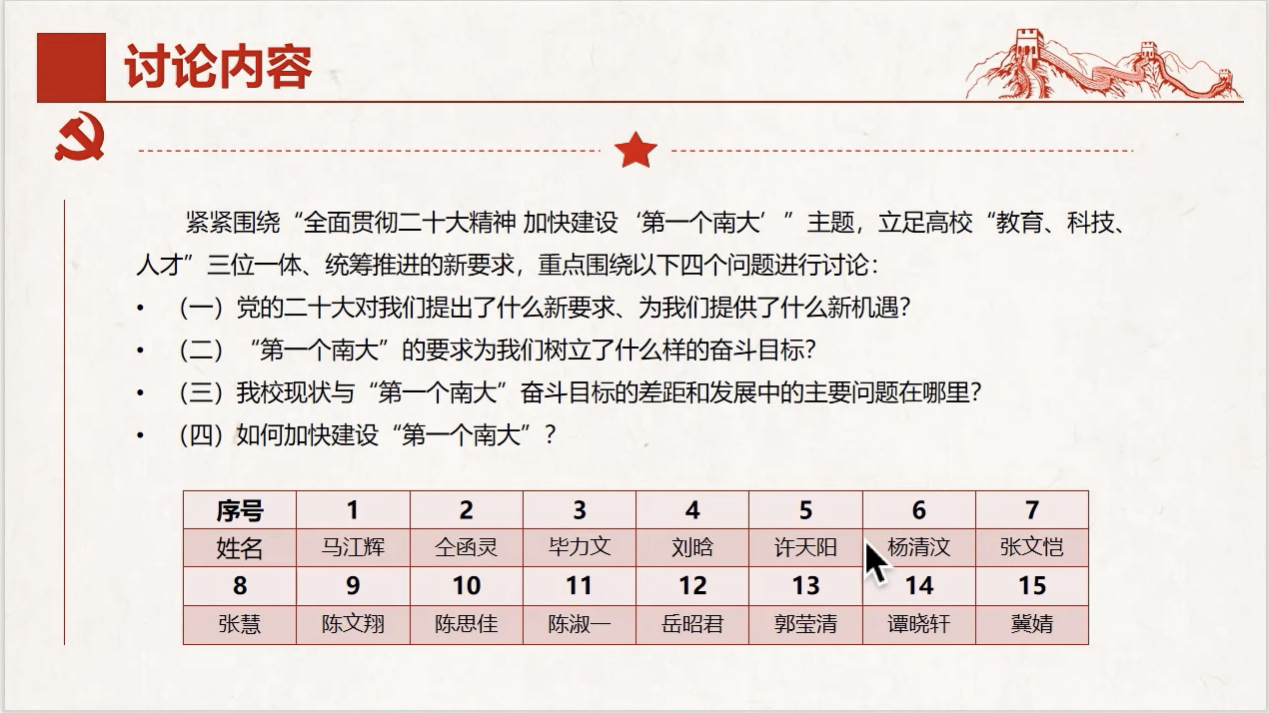 11月21日,学校发布了《关于开展“全面贯彻二十大精神 加快建设‘第一个南大’”大讨论活动的通知》。11月22日,工程管理公司党委第一时间进行部署,设计了“大讨论”开展情况汇总表,要求各党支部、各系各单位重点围绕"党的二十大对我们提出了什么新要求、为我们提供了什么新机遇?‘第一个南大’的要求为我们树立了什么样的奋斗目标?公司现状与‘第一个南大’奋斗目标的差距和发展中的主要问题在哪里?如何加快建设‘第一个南大’?"这四个问题展开大讨论。11月27日,betway88西汉姆联2021级硕士生工业工程党支部开展“大讨论”主题党日,全体员工党员聚集讨论主题逐一发言,表示建设“第一个南大”要鲜明“南大风格”,靓丽“中国特色”,围绕一流目标不动摇,把建设一流团队队伍、培养拔尖创新人才、提升科学研究水平贯穿办学全过程,在全校上下形成强大合力。