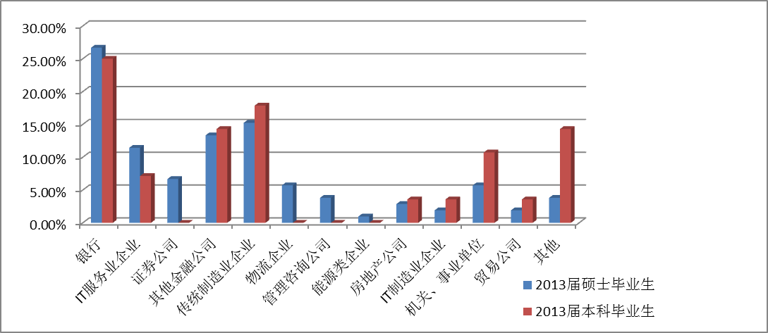 从就业单位所处的行业结构来看,学院2013届毕业生的去向主要集中于银行、传统制造业、其他金融公司等,这和学院的专业学科设置基本对应。