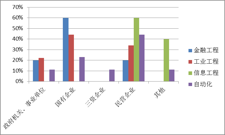 针对以上现象,我们对各专业本科生的就业单位进行进一步调查,发现大多数金融工程的同学进入了国有控股银行,所以就业主要集中于国营企业。而工业工程的同学由于本科所学知识较为多样,所以就业也较为多元化,不仅涉及银行、也包括制造企业、贸易公司等。而自动化专业、信息工程专业的同学则大多进入了高新科技企业,这类企业以民营企业居多,如华为等。