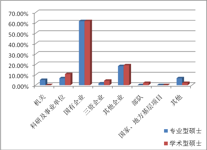 该图表明,本科生和硕士就业所在地区分布差别不大。东部发达地区仍然是学院毕业生首选的就业地区,在所有毕业生中,就业地区属于东部的高达90%左右,而选择在中西部地区就业员工比重却不到12%。分析造成这一现象的原因,首先是我国经济发展的区域不平衡,东部地区的就业机会和发展前景要优于中西部地区,其次,学校所在地和大部分生源所在地属于东部地区,毕业生也更倾向于就近在东部地区就业。