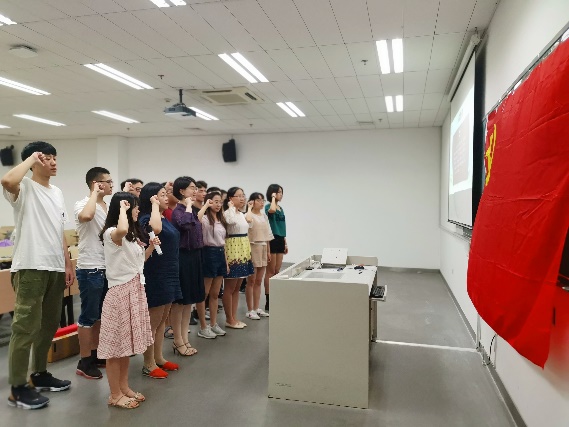 在重温入党誓词环节,全体党员面对党旗庄严宣誓。之后,全体与会人员观看了江苏省委组织部的重温宣誓视频,对入党誓词的发展历程和内涵意义有了更为深入的感悟与理解。大家回忆起入党的初心,再次表达了为党的事业奋斗终身的理想和决心:“先锋模范作用不能仅仅停留在口头上,既要内化于心,又要外化于行,遇到困难想退缩的时候,不能忘记自己是一名党员和在党旗下庄严宣过的誓言。”