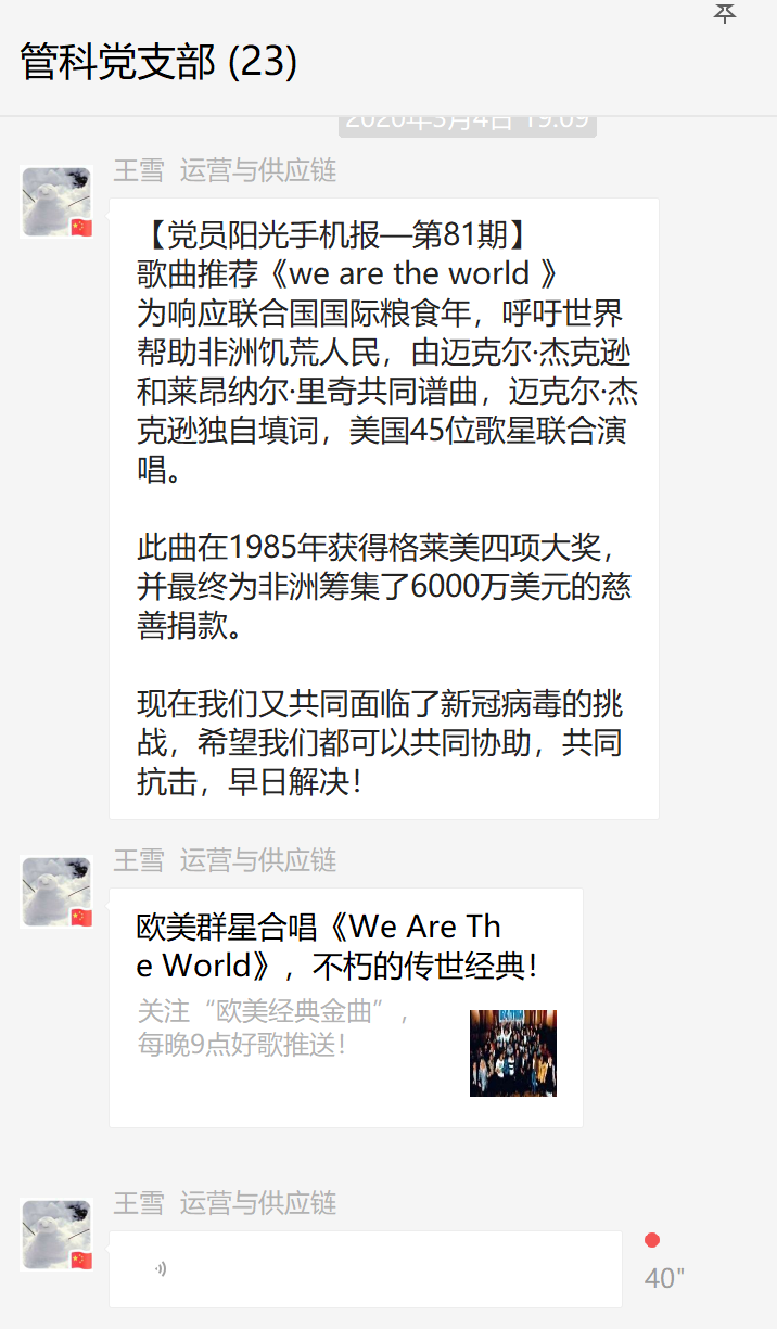 此外,其他支部的“云端”党日也精彩纷呈、兼具实效。如:本科生党支部开展了“学雷锋、共抗疫,自勉不息”主题活动;博士党支部以“疫情期间作为党员如何发挥先锋模范作用”为主题开展了讨论;2019级硕士第一党支部开展了集中学习;第二党支部开展了“云上话新冠,路遥而情切”主题党日;第三党支部吴超同志,分享了自己担任社区志愿者的经历;第四党支部每两人结对组成学习小组,录制视频解读文件精神,分享学习体验。工程管理公司党委副书记陈力立希望每名员工党员在疫情中都可以做到胸怀大局,以青年担当之心“树”好党员形象,“立”好党员品行。