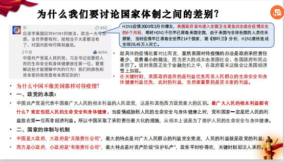 2018级硕士第二党支部的支部书记裴华飞给支部党员们上了一堂题为“建国三问”的主题党课。课上,他以“为什么我们要讨论国家体制之间的差别?”、“东西方制度差别在何处体现?”、“如何听党指挥、忠于人民?”等三个问题为主线,结合疫情期间的实际事例,从政治,军事,经济等方面,生动阐述了我国的国家制度和国家治理体系具有多方面的显著优势,这些显著优势,是我们坚定中国特色社会主义道路自信、理论自信、制度自信、文化自信的基本依据。他号召党员们切实提高政治站位,进一步增强责任感、使命感和紧迫感,在疫情中做出力所能及的贡献。支部党员们表示将在疫情中勇于亮明党员身份,敢于承担党员职责,“我们要带头做好舆论引导,不造谣、不传谣、不信谣,带头维护社会公共秩序,引导身边的人正确理解、积极配合、科学参与疫情防控工作”。