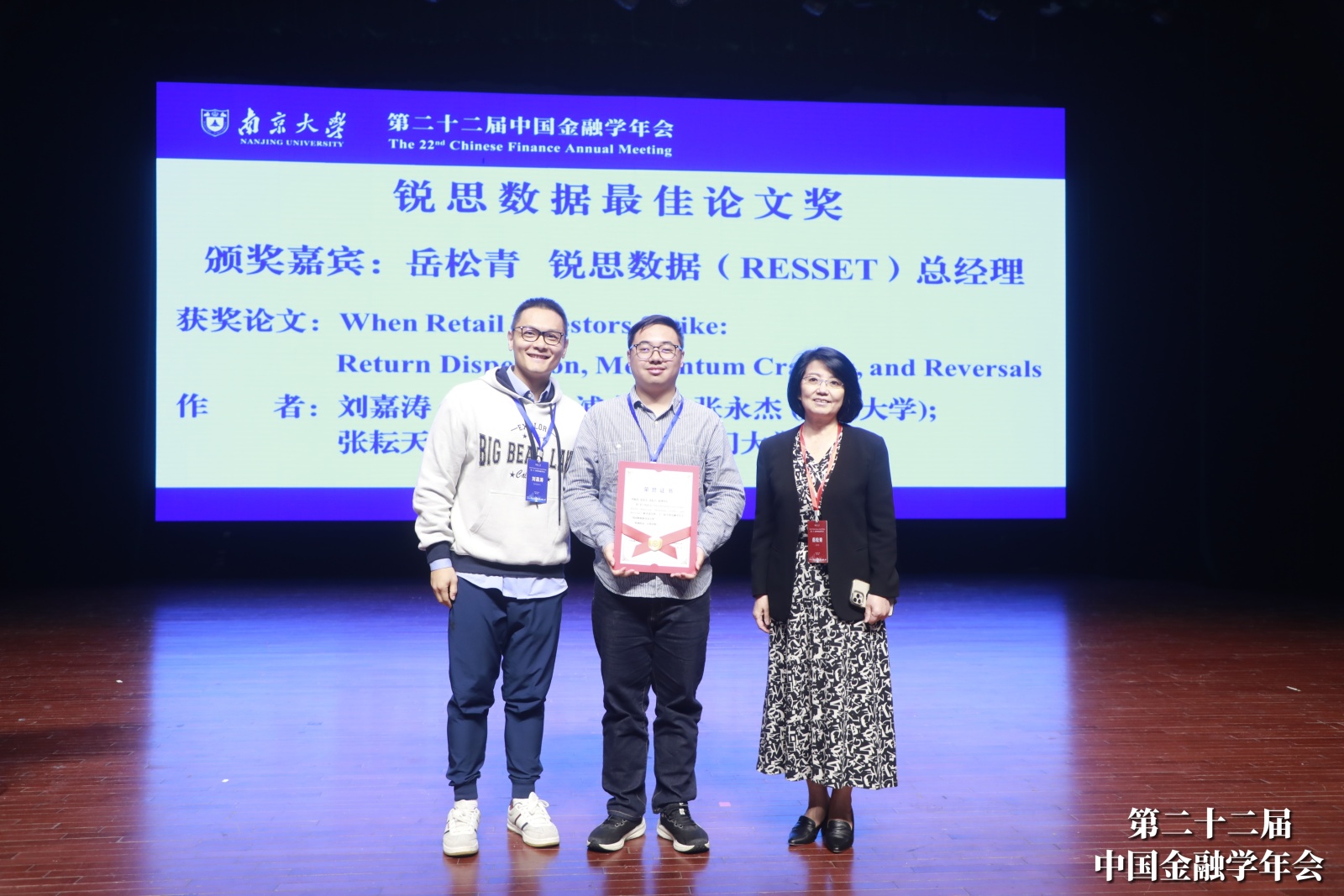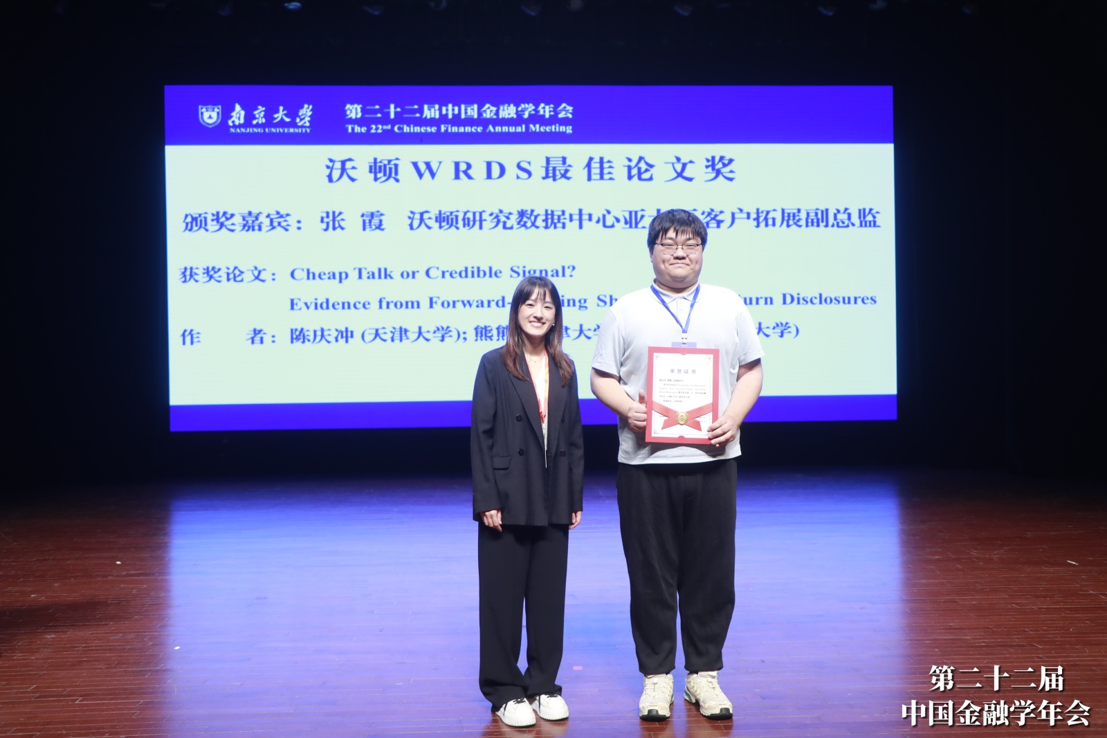 上海交通大学吴冲锋教授,广东金融学院董事长易行健教授,首都经济贸易大学副董事长尹志超教授,天津财经大学副董事长马亚明教授,中央财经大学董事长助理、金融学院经理张学勇教授,中南财经政法大学副董事长周铭山教授,西南财经大学副董事长王擎教授作为开奖嘉宾宣读获奖论文名单。中山大学原副董事长李善民教授,广东财经大学原副董事长邹新月教授,南方科技大学李仲飞教授,厦门大学郑振龙教授,锐思数据(RESSET)总经理岳松青女士,沃顿研究数据中心(WRDS)亚太区客户拓展副总监张霞女士,中国金融学术研究网(CFRN)代表、南开大学李昊然助理教授为最佳论文获奖作者颁奖。