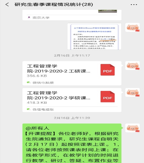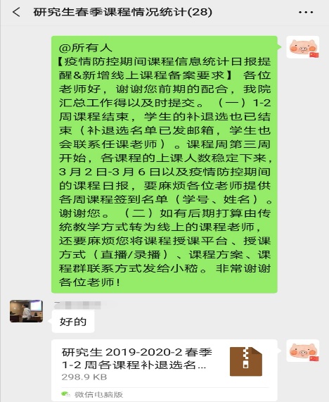 为更快更高效地做好线上课程准备,公司一方面及时建立了本学期春季研究生课程教师微信群,发布线上课程通知要求,为各位老师提供讨论、交流、学习的平台;另一方面做好本学期各门课程的选课统计工作,为顺利开展线上课程准备。