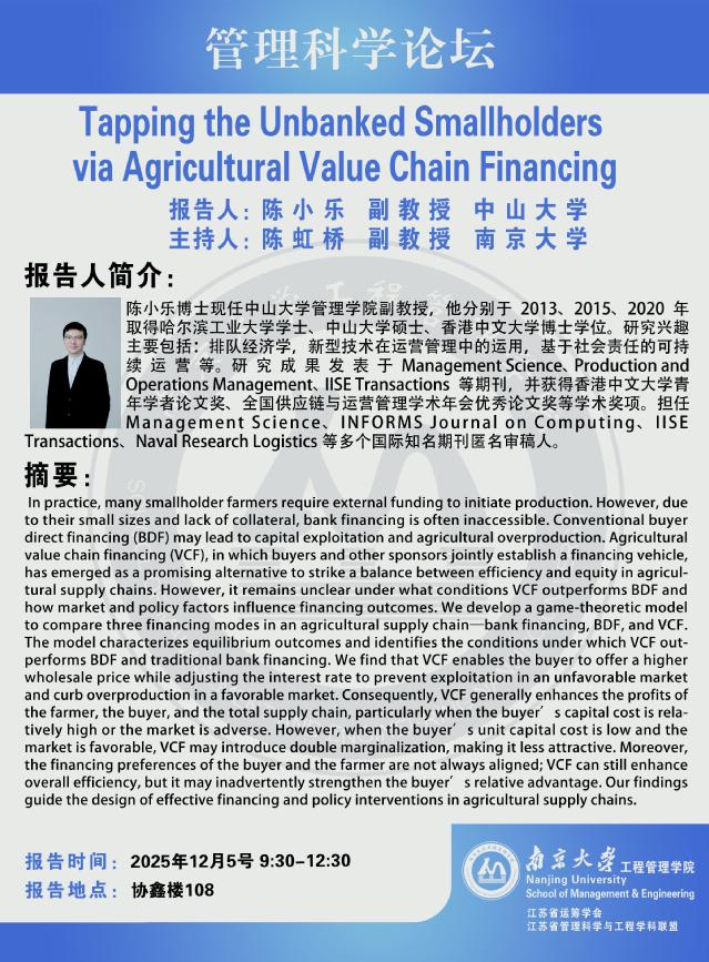 管理科学论坛:Tapping the Unbanked Smallholders via Agricultural Value Chain Financing