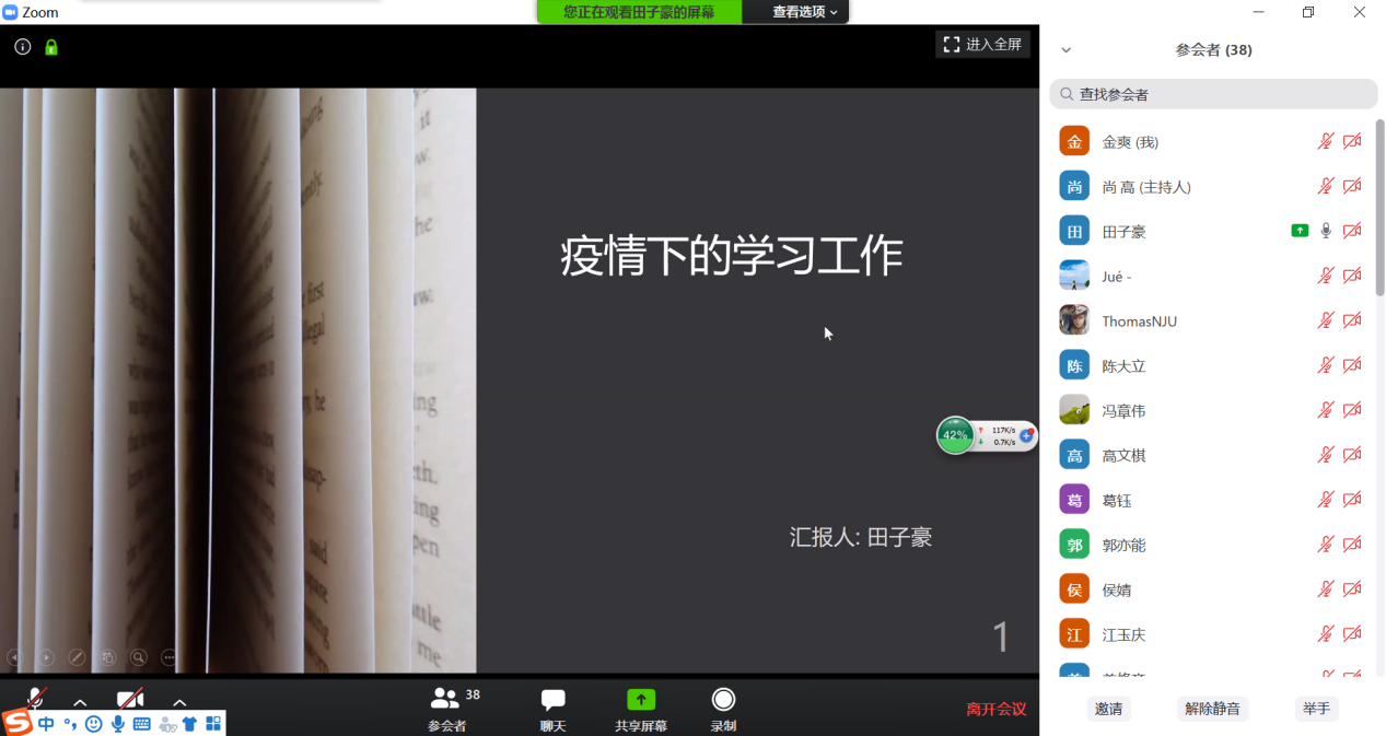 在“勇立潮头,争当先锋”的主题活动环节。首先,大家一起观看了一段关于南大人勇做抗疫先锋的视频——南大人的战“疫”之路。视频中,南大医护人员百里逆行,师生员工捐款捐物,结合专业所学做出力所能及的贡献。视频观看结束后,活动进入“争当先锋”分享环节。入党积极份子田子豪为大家分享了疫情下资源共享、线上交流合作、室内劳逸结合等方面的内容,还从管理学的视角提出了结合疫情可研究“从网络演化看病毒传播特征”、“从管理优化看病毒控制策略”等课题思路。党员唐开强分享了自己创业的经历,他的公司主要涉及仿生机器人研发,人工智能教育培训两个领域。他为大家分享了疫情期间如何积极转变思路,把握新的机遇,以及创业公司在疫情下的担当和社会责任。他用自己的努力践行着“把科技成果应用在实现现代化的伟大事业中”。此外,支部还有许多优秀的博士生党员在疫情之下,坚持回归学术初心,坚持以国家社会需求和学术前沿为导向做科研。