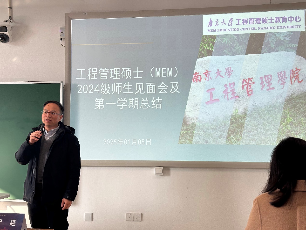 接下来,宁延主任进行第一学期总结,他从课程安排,前沿讲座、出勤及作业、任课教师情况等四个方面对本学期的教学开展情况进行了回顾。接下来介绍了2024级MEM师生互选过程与结果,鼓励同学们在院训和校训的精神引领下,继续保持学习热情,合理安排下学期学习计划,跟导师多交流,积极开展论文工作,严守学术道德底线,保证论文的进度和质量。