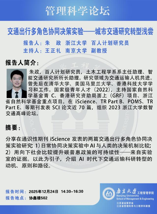 管理科学论坛:交通出行多角色协同决策实验--城市交通研究转型浅尝
