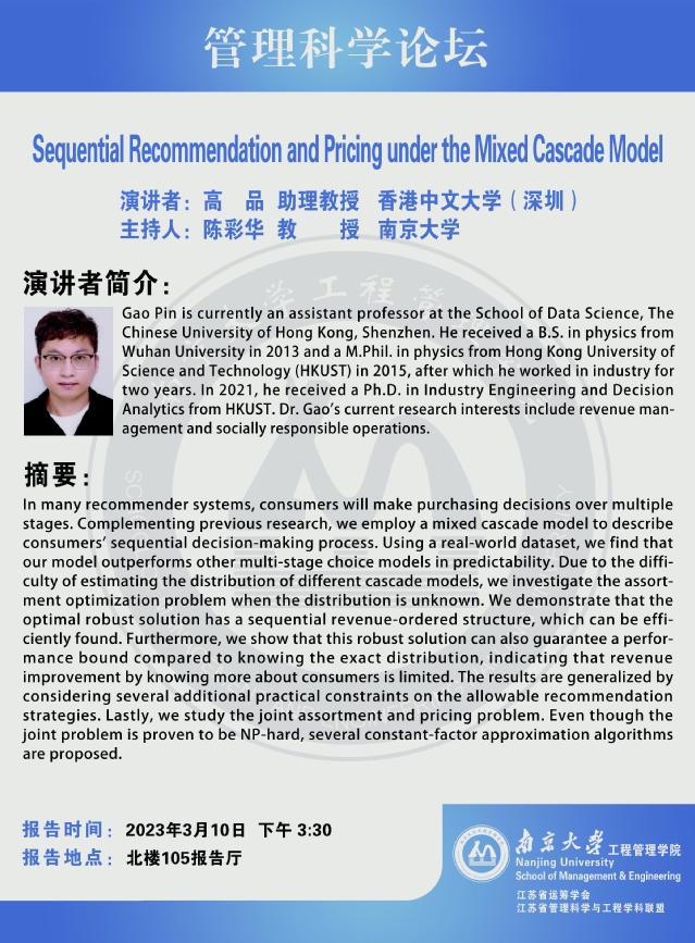 管理科学论坛:Sequential Recommendation and Pricing under the Mixed Cascade Model
