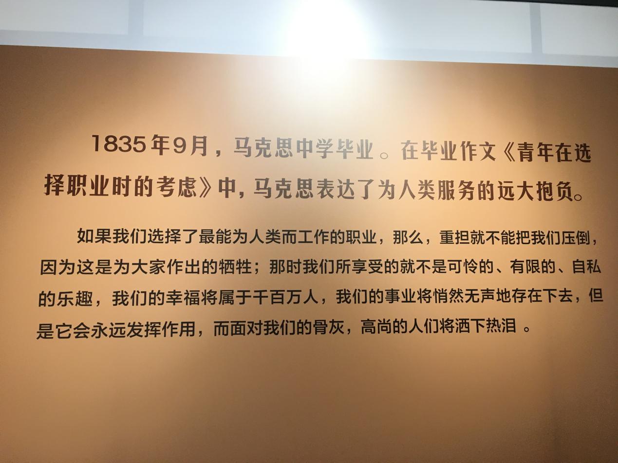 在中学毕业作文《青年在选择职业时的考虑》中,17岁的马克思就决定了为人类福利而劳动的职业期许,让即将踏入社会的同学们深受触动。这对于当代青年的有重大意义,激励我们要有使命担当,为中国梦添砖加瓦。