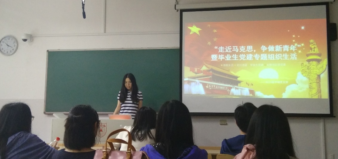 首先,支部书记为党员们上了一堂生动精彩的专题党课。党课分为三部分,第一部分主题为“走近马克思”,回顾了马克思的生平事迹、与夫人燕妮的爱情故事以及和恩格斯的伟大友谊,讲解了马克思的主要著作、理论思想和马克思主义的深远影响,并带领大家共同学习了习总书记在5月4日讲话中提到的关于如何在新时代学习和实践马克思主义的重要内容。党课的第二部分主题为“争做新青年”,结合习总书记在北大师生座谈会上提出的给广大青年的几点希望,号召党员们做“爱国、励志、求真、励行”的新时代青年,把个人的成长与十九大提出的战略安排紧密联系在一起,勇担时代使命。党课的第三部分主题为“毕业生党建”,为党员们详细讲解了组织关系转接等事宜,进一步加强毕业生的党员意识。希望大家在将来的工作岗位上继续发挥党员的先锋模范作用,做一名合格的共产党员。