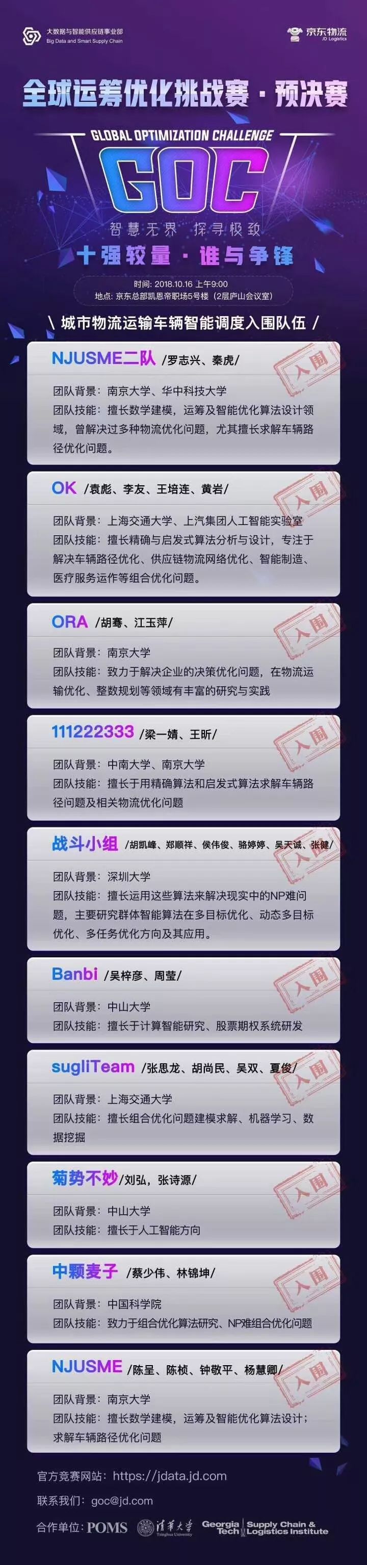 据悉,本次全球运筹优化大赛由京东物流和京东大数据与智能供应链部共同举办,集结全球运筹优化爱好者,共同去探寻最优的路径、最优的库存,系全球首个运筹优化挑战赛。赛事历时四个月,包含“城市物流运输车智能调度”以及“仓储网络智能库存管理”两道赛题。大赛共吸引了3519名参赛选手,覆盖了全球600多个顶级学府和机构,涉及麻省理工学院、斯坦福大学、佐治理工学院、新加坡国立大学、纽约大学、哥伦比亚大学、宾州州立大学、清华大学、北京大学等。