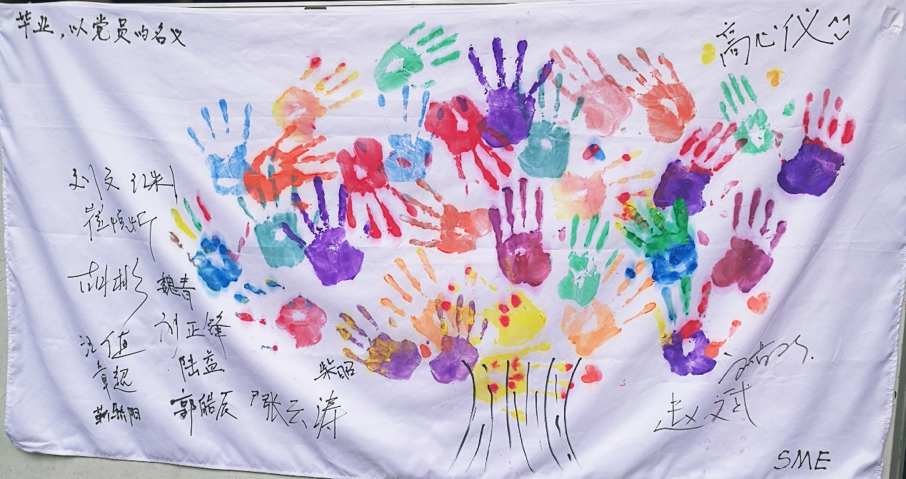 在活动的尾声,参加活动的全体成员在一面白色旗帜上印上自己的手印,掌印搭配树干形成一颗色彩斑斓的树,象征着14级毕业生茁壮成长,即将开始新的篇章。