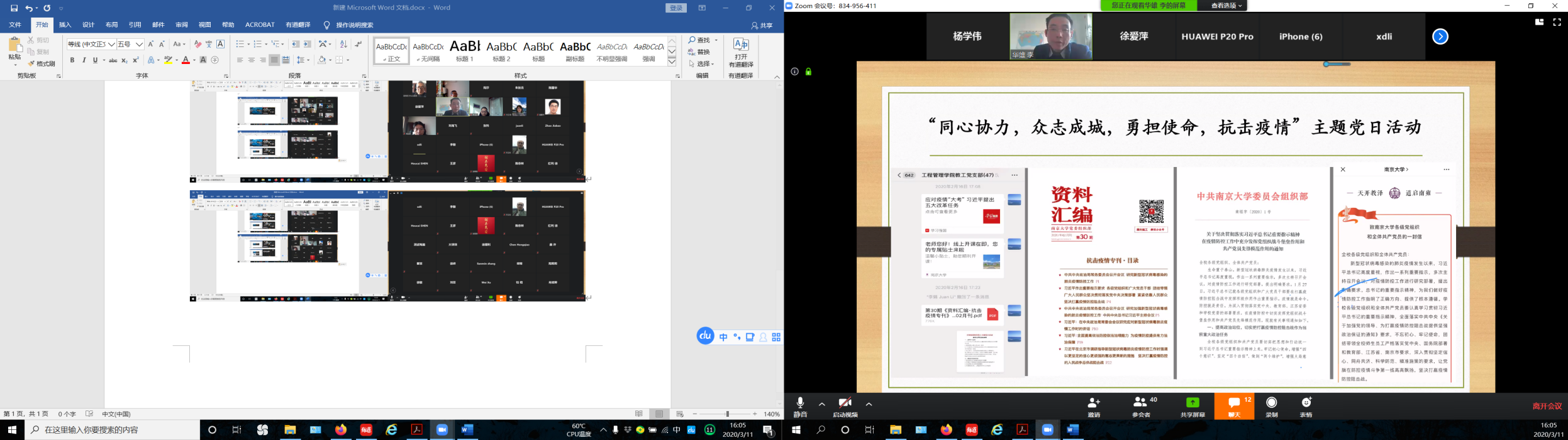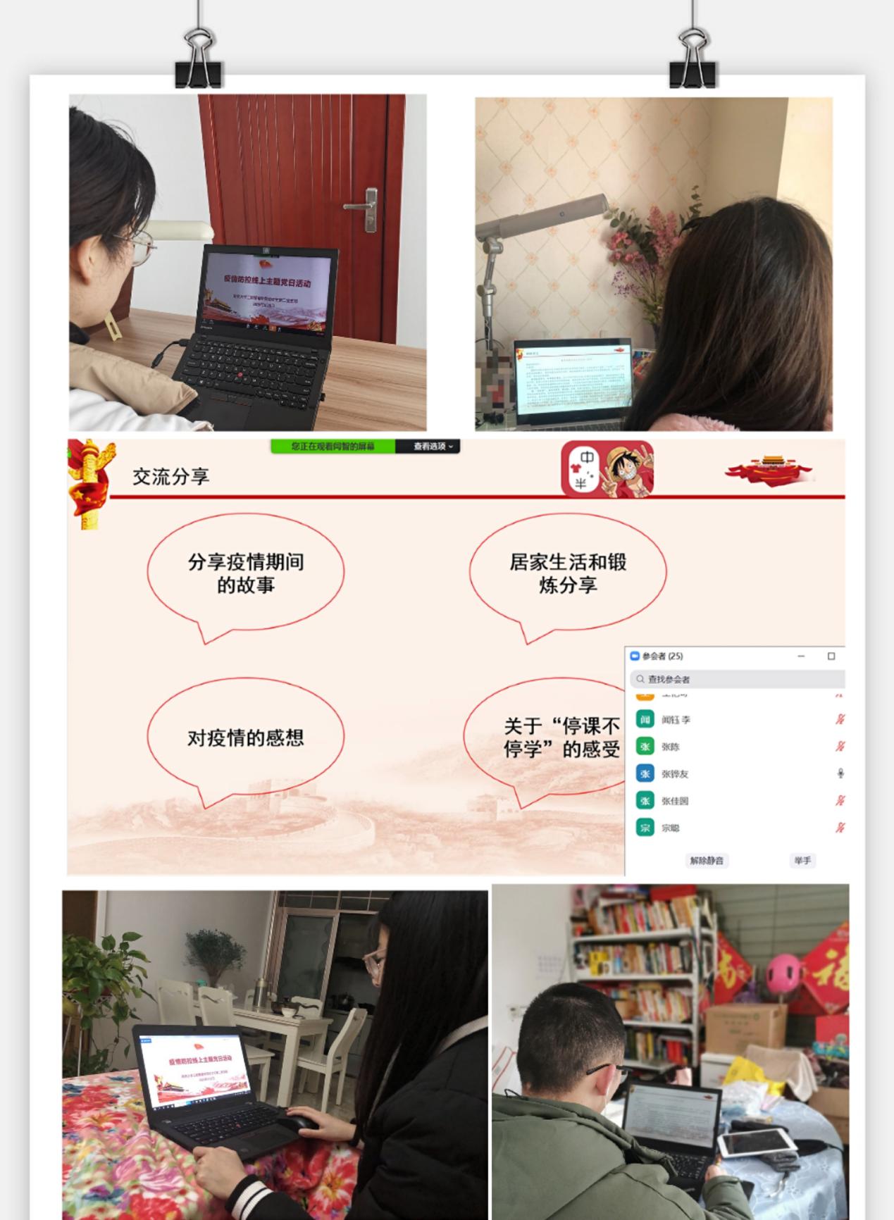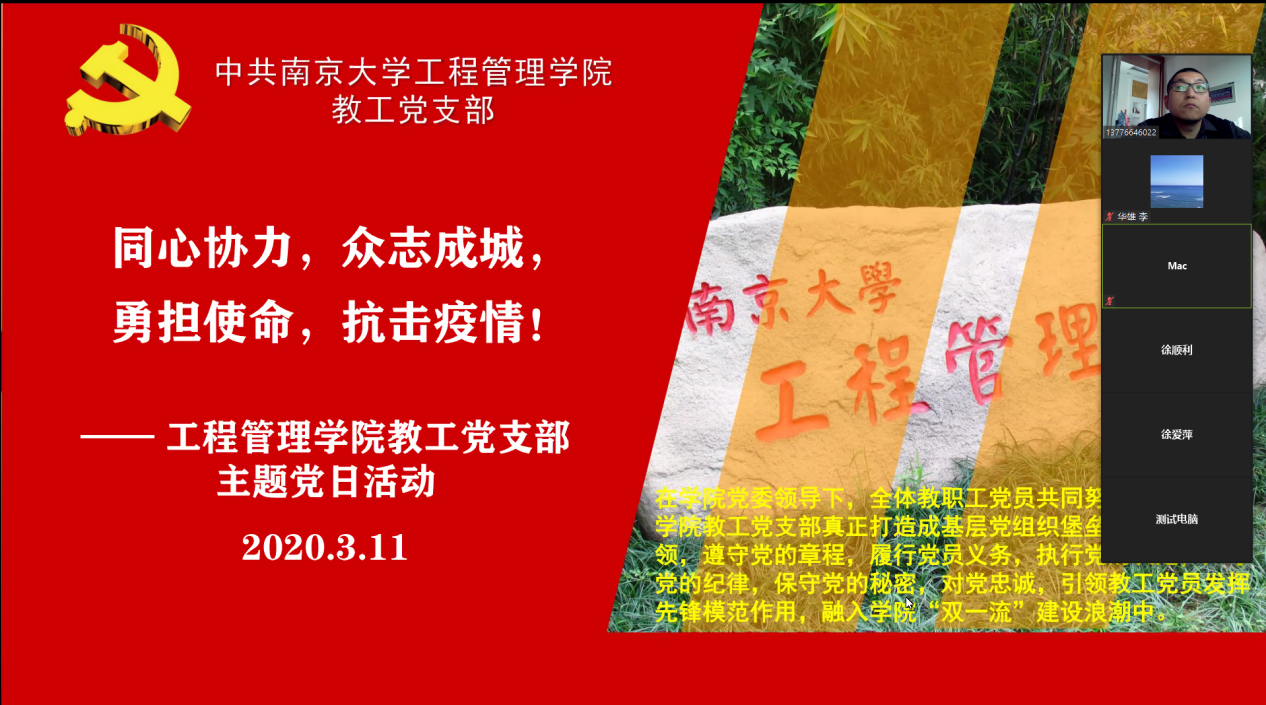 此外,其他支部的“云端”党日也精彩纷呈、兼具实效。如:本科生党支部开展了“学雷锋、共抗疫,自勉不息”主题活动;博士党支部以“疫情期间作为党员如何发挥先锋模范作用”为主题开展了讨论;2019级硕士第一党支部开展了集中学习;第二党支部开展了“云上话新冠,路遥而情切”主题党日;第三党支部吴超同志,分享了自己担任社区志愿者的经历;第四党支部每两人结对组成学习小组,录制视频解读文件精神,分享学习体验。工程管理公司党委副书记陈力立希望每名员工党员在疫情中都可以做到胸怀大局,以青年担当之心“树”好党员形象,“立”好党员品行。
