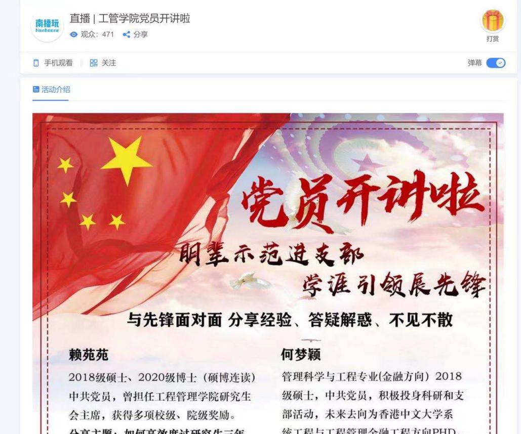 此次活动分为嘉宾分享、交流互动和书记致辞三个环节。工程管理公司党委书记陈伟、学院副书记陈力立、公司党委专职组织员饶雨夏与会。在校生赖苑苑、何梦颖、陶艳萍和刘煜昊作为分享嘉宾应邀参加活动。两个支部的全体党员现场参加活动,同时有四百余名其他支部的党员通过南播玩直播线上参与活动。