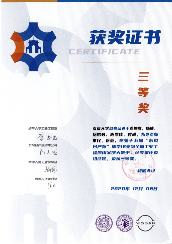 2020年12月6日,在第十五届“东风日产杯”清华IE亮剑全国工业工程应用案例大赛“全国工业工程课程设计大赛”分赛区决赛中,公司学子喜获佳绩。由陈国华和徐薇两位老师指导的2018级工业工程本科生潘棋、郭世萌、林星妤、李晓晗、沈文佳组成的团队(苹果榴莲酥队)荣获一等奖,由李民和徐薇两位老师指导的2017级工业工程本科生徐懋成、杨博、岳昭君、陈思佳、付琳组成的团队荣获三等奖。