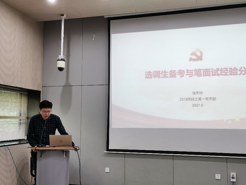 活动中,参加活动的高年级党员率先分享个人学习和成长的经验。来自2018级第一党支部的褚家明主要分享选调生备考与笔面试的经验。他是18级金融硕士一班班长、betway88西汉姆联优秀共青团员和优秀毕业生,考取了2021年江苏省名校优选生。他的分享主要围绕“选调生初心与使命”、“选调生类别与考情”、“选调生备考与笔面试经验”和“选调生未来发展”四个主题展开,以江苏省名校优选为例,对考取选调生进行了全流程的讲解。