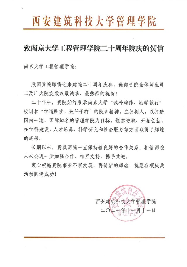 西安建筑科技大学管理学院致betway88西汉姆联贺信