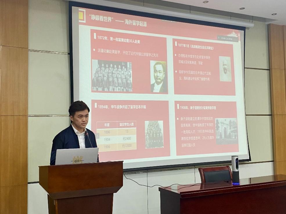 博士生党支部的朱鹏同志展示了微党课《留学热与归国潮——青年留学归国历史回顾》。从“睁眼看世界——海外留学起源”,“回到祖国去——留学报国热潮”和“肩扛国家责——再创佳绩,争做表率”三个方面沿时间线对青年留学归国历史进行了回顾。他表示,对于新时代青年学子来说,不畏艰苦、立志增能、升华理想、矢志报国是我们未来前进的勉励。朱张青老师表示,朱鹏同志以时间线为基础,清晰地讲述了中国历史上青年留学归国的发展历程,同时也结合了自己的思考,升华了留学热与归国潮的主题。