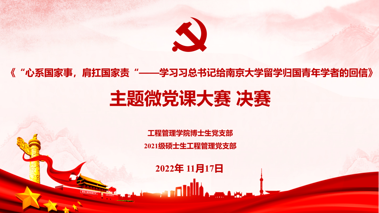为进一步深入学习贯彻落实习近平总书记给betway88西汉姆联留学归国青年学者重要回信精神,切实推进党史学习教育走深走实,11月17日下午,betway88西汉姆联博士生党支部与2021级硕士生工程管理党支部共建开展了“心系国家事,肩扛国家责——学习习总书记给betway88西汉姆联留学归国青年学者的回信”主题微党课大赛决赛。