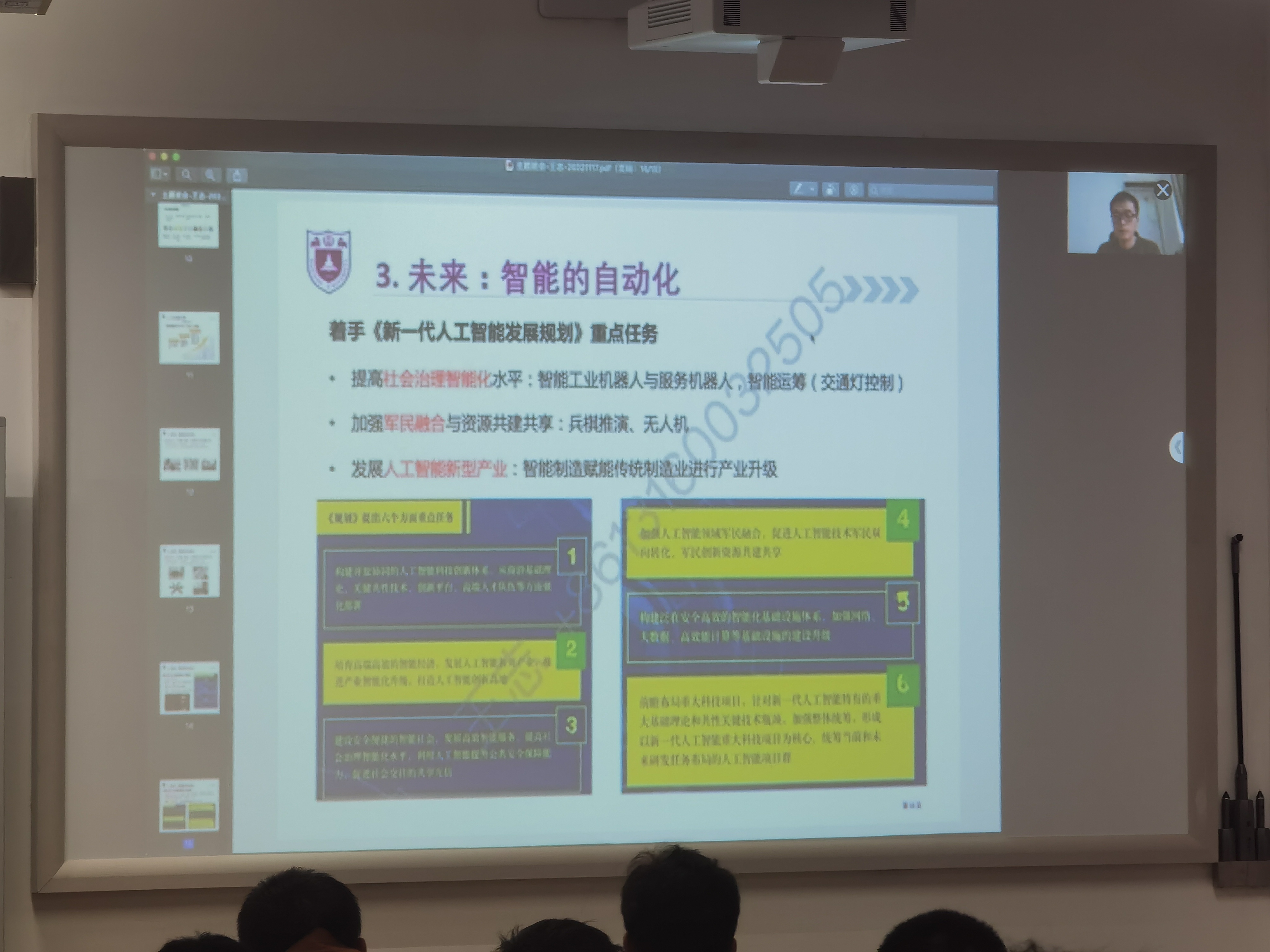 赵佳宝老师、王志老师以《工业智能的十年——“中国制造”到“中国智造”》为主题,就自动化专业的发展、中国工业智能过去十年的成就、工业智能的未来展开汇报。王老师以中国制造2025为例,讲述党的十八大以来我国制造业取得的举世瞩目的成就,强调自动化专业是与时俱进、不断适应市场发展的需要。他希望同学们在未来能够利用自动化技术,用人工智能的方法,为自动化领域提供更加智能的解决方案,为全面建设社会主义现代化国家奋斗。