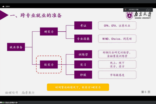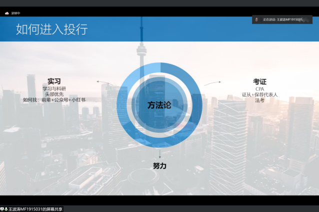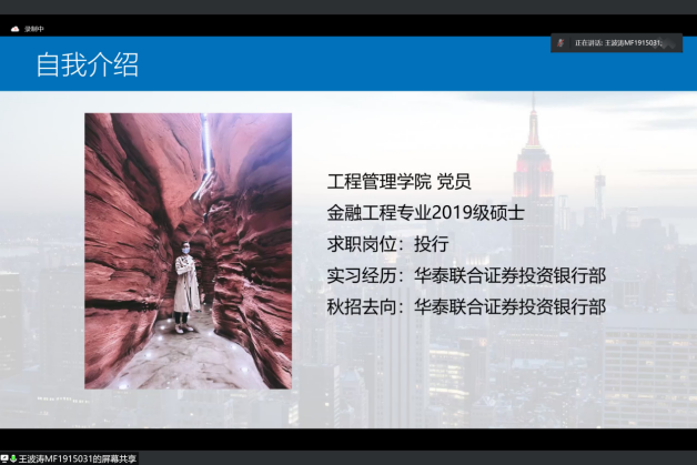 来自2019级金融工程专业的王波涛目前就职于华泰联合证券投行部,在分享中他提到从事投行工作时,要专注地学习提升自己快速成长,建立自己的核心竞争力。他认为千里之行始于足下,建议大家要勇于尝试,克服对不熟悉事物的惧怕,始终不忘初心,保持谦逊的学习态度。