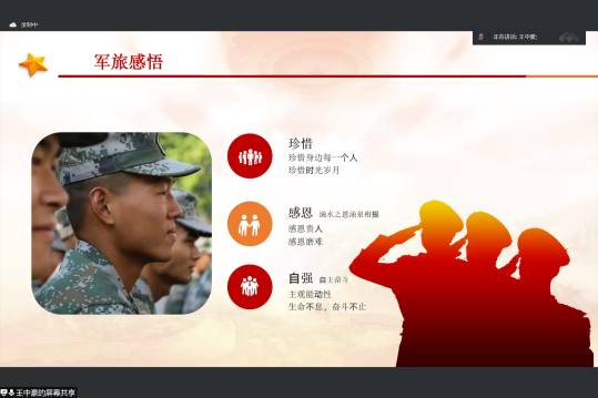 来自2021级物流工程与管理专业的王中豪同学带来《热血铸军魂》主题分享,讲述自己在中国人民解放军75222部队的两年军旅生活,在成为新兵的三个月中,爬铁丝网、三千米跑,感受到军队崇尚荣誉、拼搏战斗、自律自强的氛围。两年的军旅生活让他更加懂得珍惜、感恩与自强。