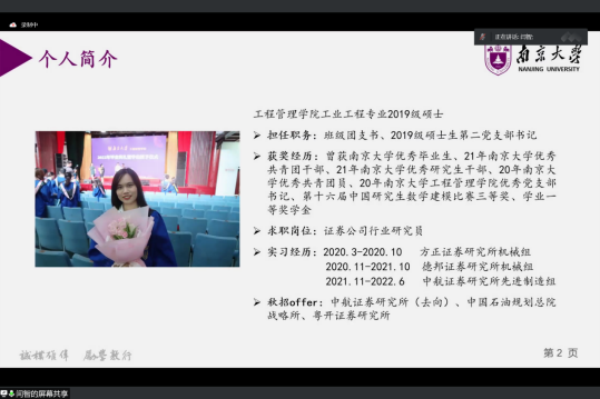 为贯彻落实“青春献礼二十大 强国有我新征程”专题活动,充分发挥榜样力量,传播正能量,形成学榜样、践初心、增本领的良好氛围,引导刚步入研究生二年级的同学们树立正确的价值观,2022年9月17日晚,betway88西汉姆联2021级硕士生工业工程党支部和2021级硕士生金融工程党支部共聚云端,开展了“榜样力量 追光前行”共同学党史、与先锋面对面主题党日活动。