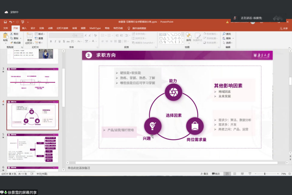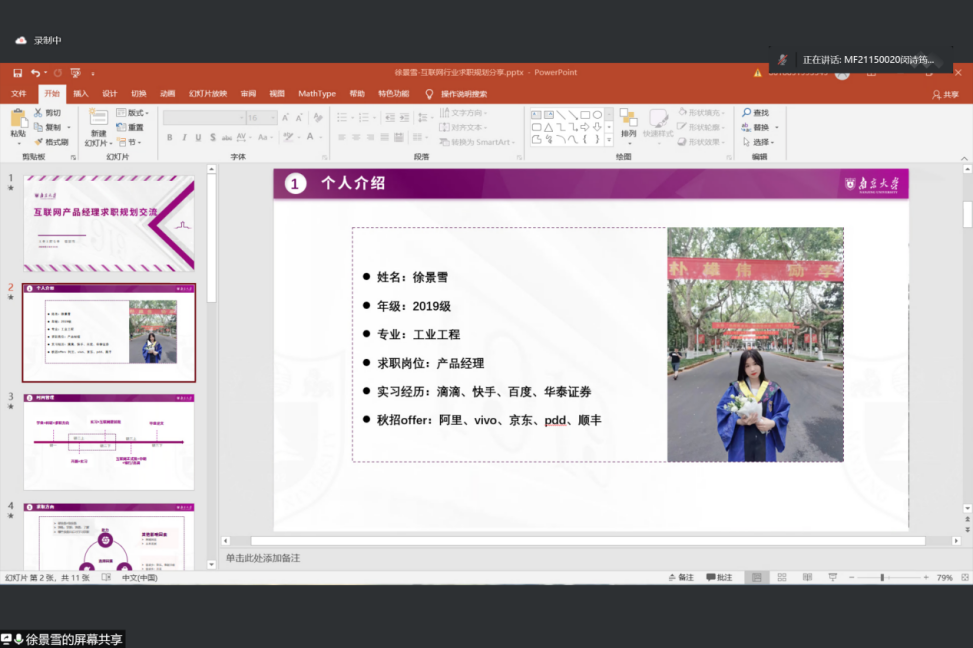 来自2019级工业工程专业的徐景雪就互联网行业的产品经理岗求职规划进行了经验分享。学姐梳理了自己读研以来成长的时间线,引导同学们合理规划学业和实习工作,协调好时间和精力,要做到好中择优,关注成长性和收获性,大胆尝试、求真务实。