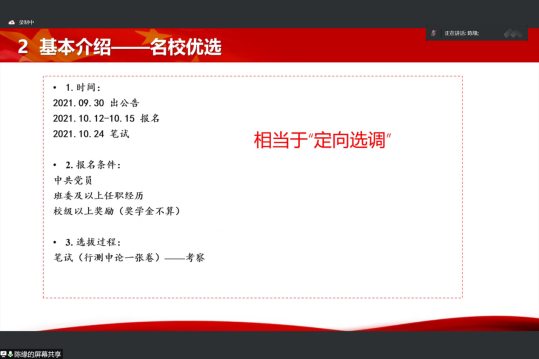 来自2019级管理科学与工程专业的陈缘就公考经历进行分享。她谈到了自己选择公考的心路历程,并对名校优选、人才引进的各方面内容进行了详细地介绍。她鼓励大家勇于尝试,探索所爱,坚定所选,奋勇向前。