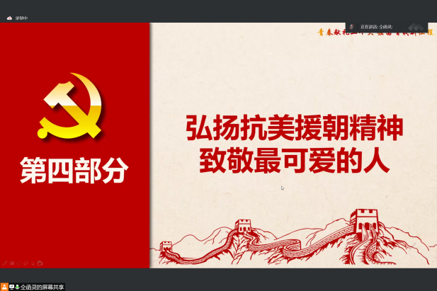 随后开展了“弘扬抗美援朝精神,致敬最可爱的人”党史学习活动,工业工程党支部副书记仝函灵讲述了抗美援朝战争的恢弘史诗。抗美援朝战争是中国人民保卫和平、反抗侵略的正义之战。伟大的抗美援朝战争,打出了新中国的国威和人民军队的军威,打破了美国军队不可战胜的神话。正如习近平总书记在纪念中国人民志愿军抗美援朝出国作战70周年大会上的讲话中所强调的,抗美援朝战争伟大胜利,是中国人民站起来后屹立于世界东方的宣言书,是中华民族走向伟大复兴的重要里程碑,对中国和世界都有着重大而深远的意义。
