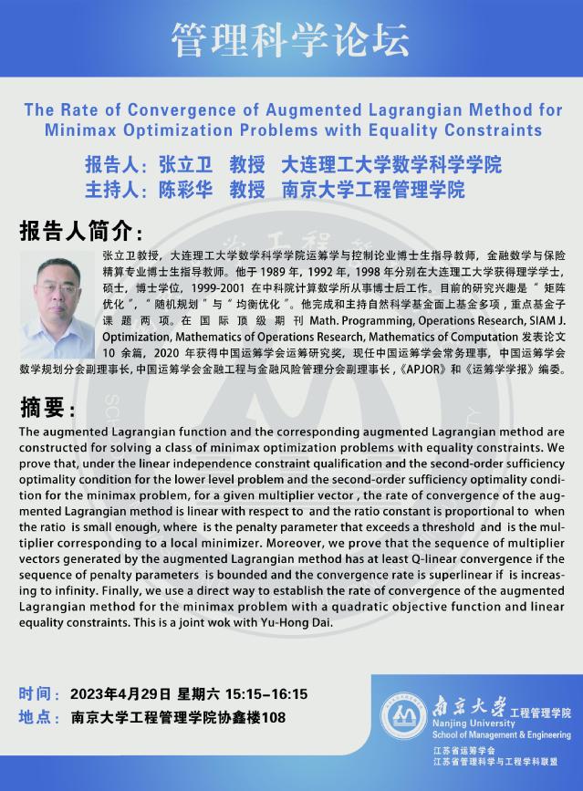 管理科学论坛:The Rate of Convergence of Augmented Lagrangian Method for Minimax Optimization Problems with Equality Constraints