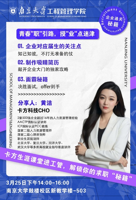 在面试应对方面,黄洁从面试官的角度出发,分析了面试官在群面、一面、终面等不同环节关注的重点,包括求职者的沟通能力、合作意识、逻辑思维和组织协调能力,还讲解了在面试中疑难问题的合理回答方法。她建议同学们在面试前要做好充分的准备,了解企业的背景、文化以及所申请职位的具体要求,同时要注意自己的仪表、语言和态度,展现出自信、积极和专业的形象。