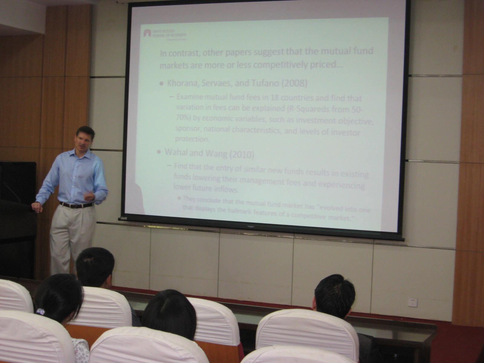 Michael Lemmon教授以轻松幽默的方式开场,给公司师生带来一场印象深刻的学术报告。Lemmon教授首先提出一个“基金费用之谜”——随着市场上基金数量的增加,基金行业竞争日趋激烈,然而基金费用却没有发生变化,同时,费用高的基金并没有相应地带来高收益。针对这一现象,Lemmon教授提出一系列假说来进行解释,研究结果表明,基金公司的初始费用具有明显的持续性,基金费用与新基金的进入、投资策略的改变以及服务的增减等没有必然关系。对这一市场异象,Lemmon教授进一步指出了这一领域今后的研究方向。张兵老师、俞红海老师及刘烨老师等就基金市场竞争程度变化,以及论文研究如何在中国市场应用与Lemmon教授进行了深入交流。