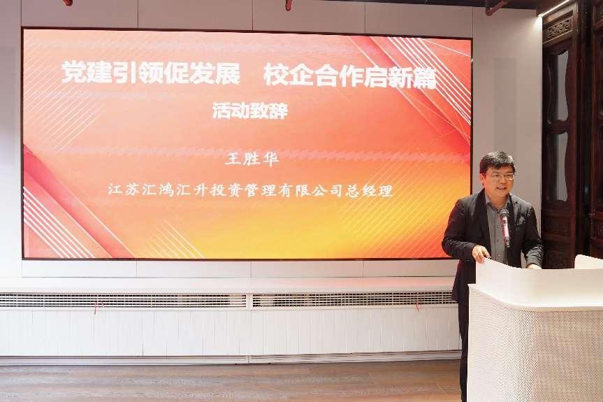 江苏汇鸿汇升投资管理有限公司总经理王胜华对师生们的到来表示欢迎,他介绍了汇鸿汇升投资的基本情况、创新业务和未来发展,并详细讲述了建设汇升投教基地的初心与过程。王胜华提出,希望通过共建进一步推动校企合作的“双向奔赴”,心怀投资者教育“国之大者”,共担中国特色金融发展之路的“时代重任”。俞红海首先向目前在汇鸿汇升投资公司工作的员工表达了学院的关心与问候。他强调,双方共建旨在进一步强化校企合作,资源共享、党员共育、活动共办,品牌共创,在党建引领下积极探索具有时代特点、体现行业特色的党建、专业人才培养融合载体。俞红海向同学们介绍了当前金融行业的发展形势、挑战与机遇,勉励大家牢牢把握时代机遇,充分利用广阔平台,与时代同步,实现更大发展。