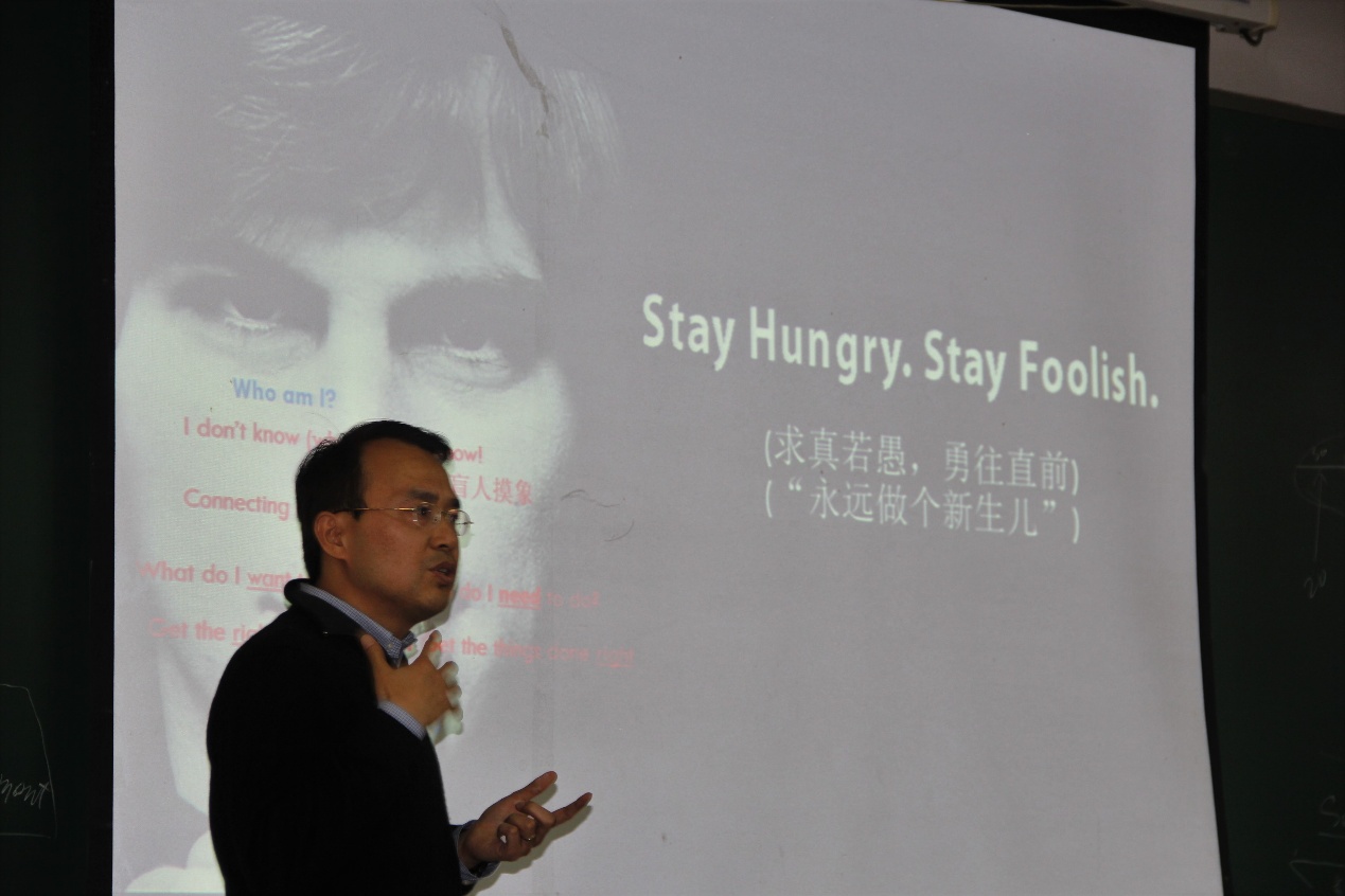 “How to handle with ‘not know(如何处理未知)?”随后,俞立老师提出了这个问题,并举出了“盲人摸象”这一例子。俞立老师表示,自己一直在实现创业梦的过程中努力着,只是比同学们多经历走了十多年,现在仍在运营公司的同时不断学习着。技术的飞速发展为我们带来了无限的机会,多学习、多阅读,从现时代的成功者身上吸取成功的经验。他认为,创业过程便是在未知领域摸索。不同的人可能遇见不同的问题,产生不同的感悟和体会,很难分清对与错。此时,创业者就要发挥积极探索的精神“求真若愚,勇往直前”,“永远做个新生儿”,不断的实践、寻找真相。即使观点与身边的人不同,被认为所行所做之事只是“皇帝的新装”,也