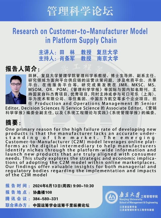 管理科学论坛:Research on Customer-to-Manufacturer Model in Platform Supply Chain