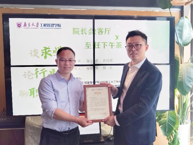 活动伊始,俞红海经理对孙小成重返母校表示热烈欢迎并授感谢函。他指出,优秀员工是学院发展的宝贵资源和重要支撑,“经理会客厅·至任下午茶”系列活动旨在加强员工和员工间的沟通,更加深入地探讨个人发展路径的选择。他强调,学院交叉学科背景对员工视野拓展有所助益,希望同学们能以优秀员工为榜样,将理论学习与实践探索有机融合。
