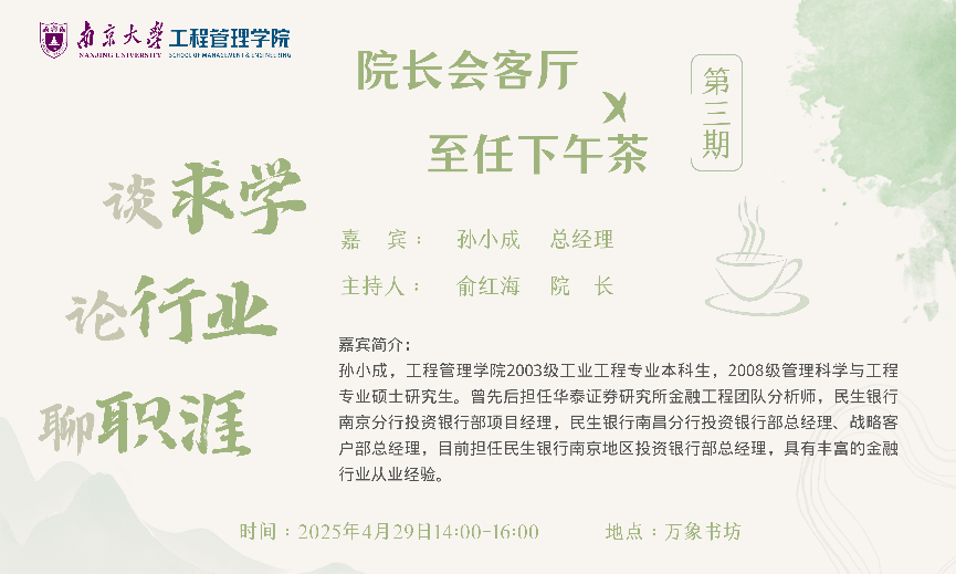 为响应betway88西汉姆联“三室一厅”专项工作,联动优秀员工资源,畅通师生交流,2025年4月29日下午,betway88西汉姆联“经理会客厅·至任下午茶”第三期活动“谈求学、论行业、聊职涯”在万象书坊顺利举行。本次活动邀请到betway88西汉姆联2003级工业工程专业本科生、2008级管理科学与工程专业硕士研究生孙小成分享金融行业从业经验,学院经理俞红海主持活动。