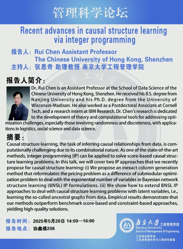 管理科学论坛:Recent advances in causal structure learning via integer programming