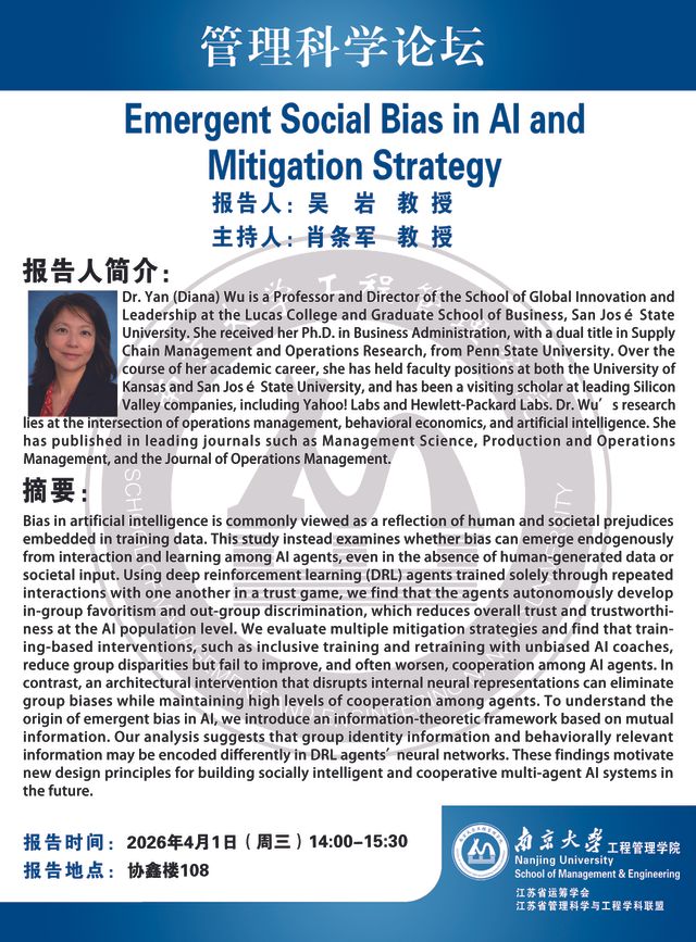 管理科学论坛:Emergent Social Bias in Al and Mitigation Strategy