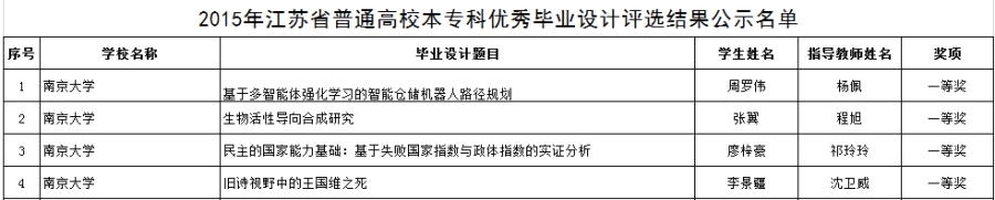 近日,省教育厅高等教育处公示2015年江苏省普通高校本专科优秀毕业设计评选结果,由公司杨佩老师指导,2012届自动化专业周罗伟完成的《基于多智能体强化学习的智能仓储机器人路径规划》获得一等奖,公司共有4个作品获此殊荣。据悉,该论文今年上半年还被SCI1区期刊录用。