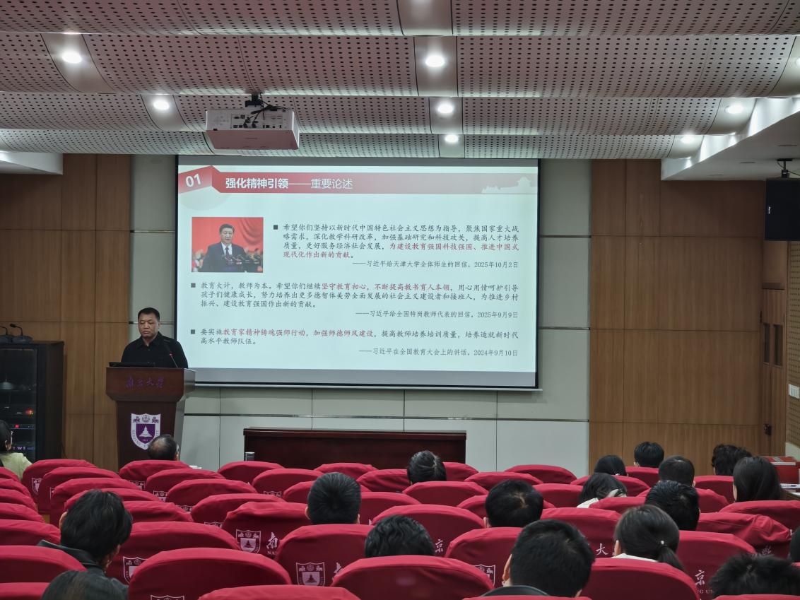 在专题案例剖析环节,他结合五类典型反面案例,以案为鉴、以案明纪,引导全体参会教师深入反思:如何坚守以德立身、以德立学、以德施教,在一言一行中做好员工成长路上的引路人与示范者?如何筑牢思想防线、严守学术规范?陈志云强调,师德师风建设没有休止符,更没有松懈期。全体教职工必须提高政治站位、强化责任担当,自觉追求师德“高线”,以高尚情操涵养师风、引领学风;始终严守职业“底线”,恪守教育初心与职业操守;坚决严禁行为“红线”,对违规违纪行为零容忍、不触碰,以纯正师德师风护航人才培养质量,为高质量发展与教育事业进步筑牢坚实思想根基。